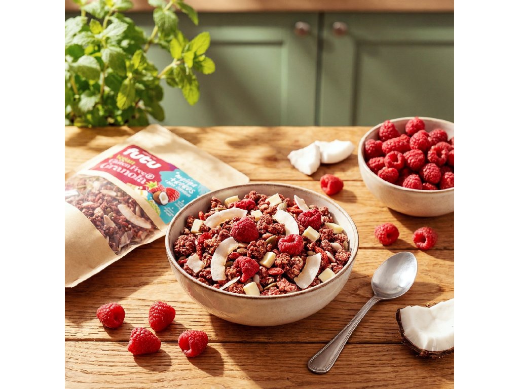 Bezlepková vegan granola Malina + kokos + biela čokoláda 300g