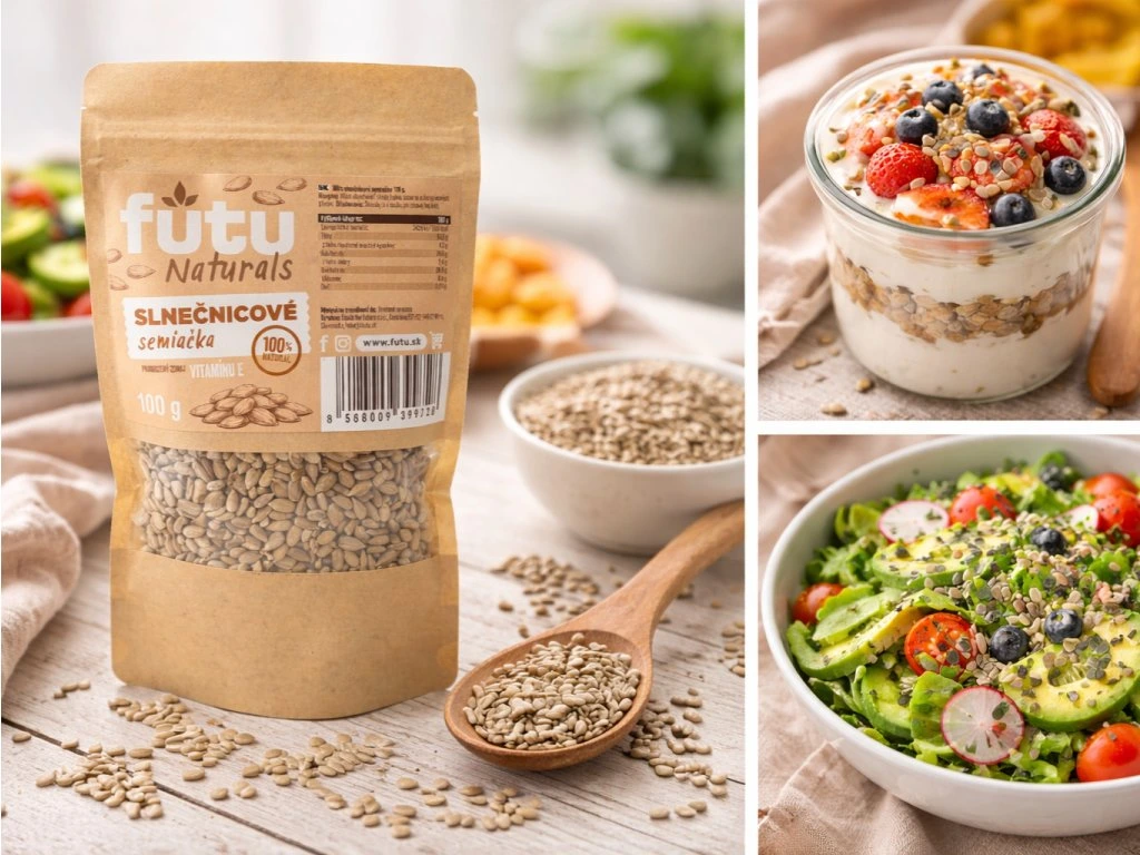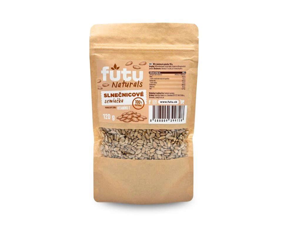Slnečnicové semiačka FUTU Naturals predstavujú prirodzený zdroj vitality, ktorý podporuje telo v jeho každodennom fungovaní aj rovnováhe. Sú bohaté na vitamín E, silný antioxidant, ktorý prispieva k ochrane buniek a zdravej pokožke. Vďaka obsahu kvalitných rastlinných tukov a minerálov, ako je horčík a selén, podporujú správnu činnosť srdca, nervového systému aj celkovú regeneráciu organizmu.